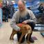 ALT: a white teddy bear is standing on a scale next to a small green dinosaur .